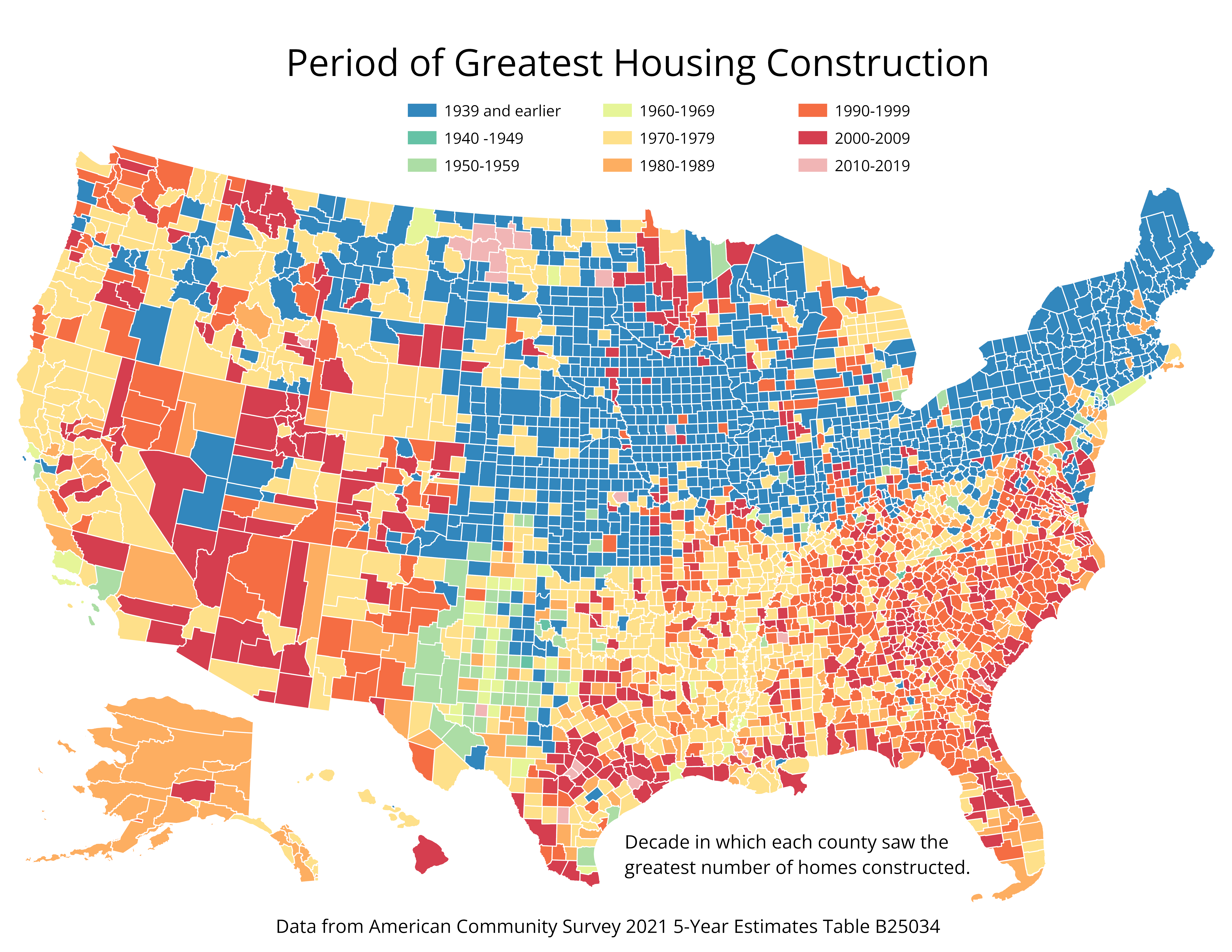A choropleth map visualizing U.S. counties by the decade in which each county saw the greatest number of homes constructed.